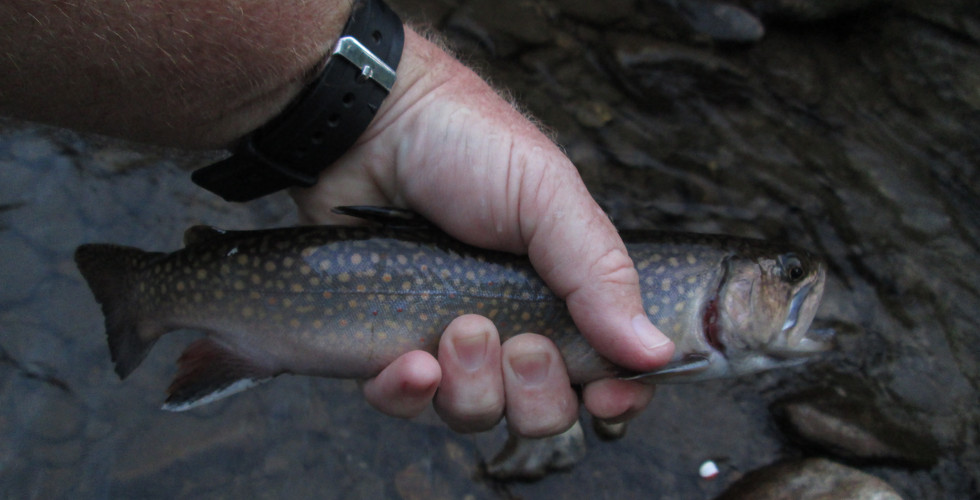 After running some errands and conducting a soccer training session, I needed to cool off and catch some trout. My "go to" spot when I don't have a lot of time is always Jonathan Creek in Maggie Valley. I changed clothes at the Mary Rathbone Rich Park and fished a short stretch beside the park, catching a stocked brown and three small wild browns. From there I went to the lower bridge at Frank Mehaffey Road and fished up to the RVs right beside highway 19 (one-tenth of a mile, according to my car odometer). The last stocking took place Friday, June 21, but there were still plenty of stocked brook trout spread out all through the section I fished. The water was up for this time of year, so I fished a size 14 bead head hare's ear nymph and one split shot below a neon orange strike indicator. I caught 17 trout through that stretch, including two small wild rainbows that would not cooperate for a picture. They all fell for the bead head with one notable exception. At a pocket on the right that always contains a fish or two, I had four consecutive takes on the indicator by what was probably the same stocked brookie. Seriously! For four casts in a row, this fish came up from the bottom of a deep pocket, latched on to the neon orange indicator, and took it back to the bottom! I had to fight the urge to set the hook, because that pulls the indicator out of the trout's mouth and also pulls the nymph up past his body, usually resulting in a foul-hooked fish. After the fourth take, I gave in and tied on a bright orange bead head that I tie for really dumb, newly-stocked fish, and he took it on the first cast. Maybe he learned his lesson.